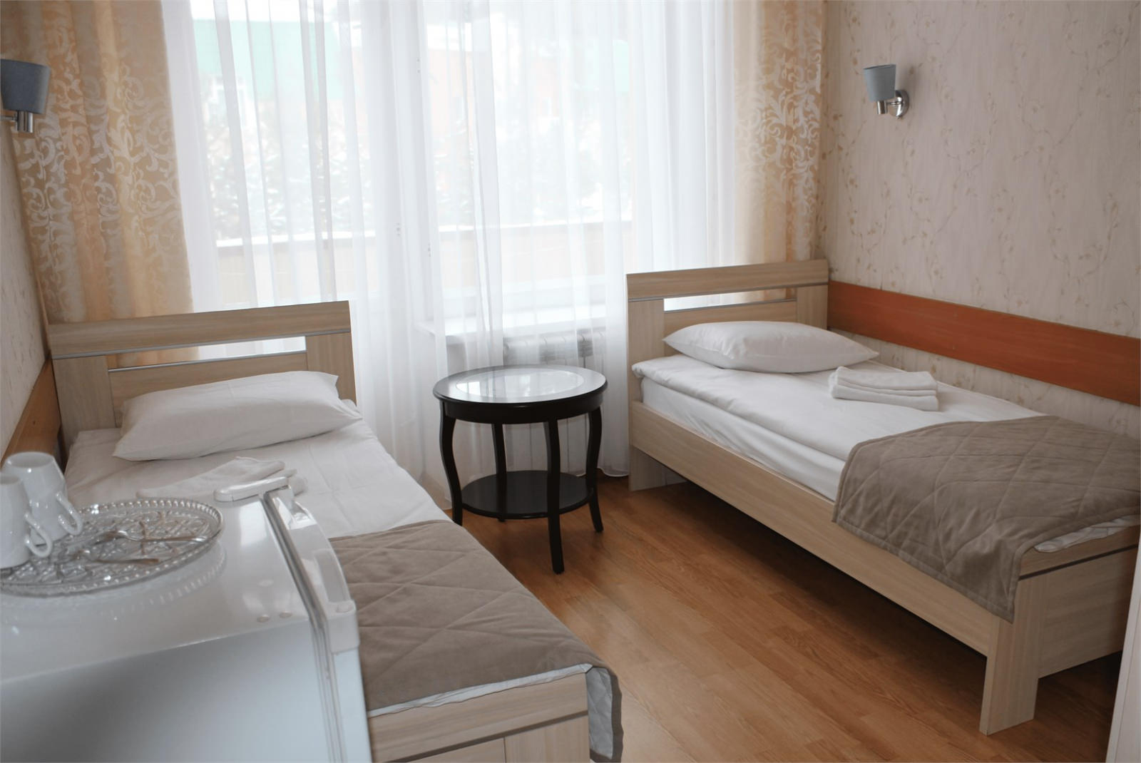 Площадь номера - 12 кв.м. 2 осн. места. 1 доп. место. Мебель: вешалка, зеркало, кровати односпальные /одна двуспальная кровать, прикроватные тумбочки, стол, стул, шкаф. Оборудование: телевизор ЖК, чайный набор посуды, электрочайник. Санузел: с душевой кабиной, туалетные принадлежности. Сервис: Wi-Fi бесплатно, смена полотенец, смена постельного белья, уборка номера.
